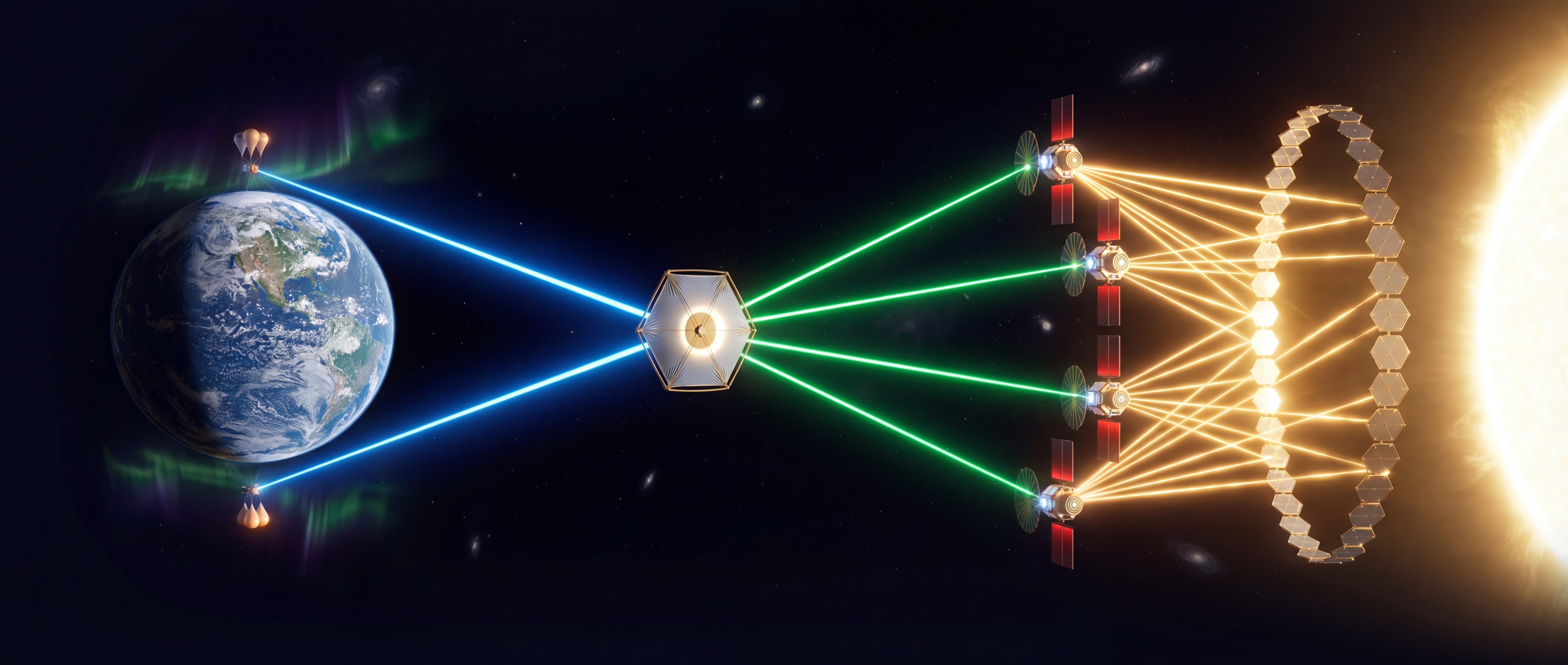 Cei 4 sateliți colectori convertesc energia solară concentrată în fascicule laser de mare putere (eficiență 43%), echipați cu sisteme de propulsie ionică pentru menținerea orbitei și transmițătoare laser direcționale spre nodurile Lagrange.